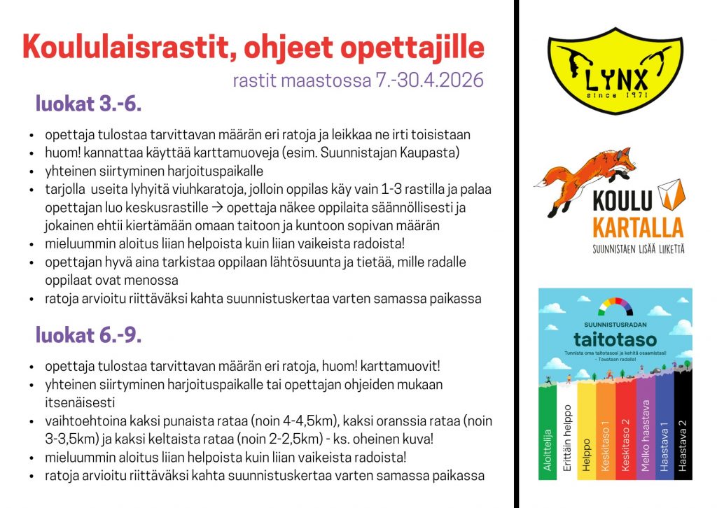 Osana teemaviikkoja Lynxin suunnistajat ylläpitävät koululaisrastistoja kahdeksassa maastossa koulujen läheisyydessä. Koululaisrastit ovat maastoissa 7.-30.4.